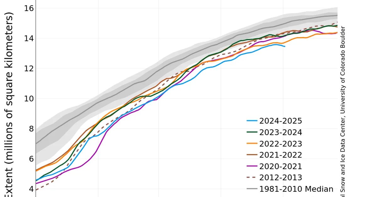Arctic sea ice is set to reach one of its smallest winter peaks on record due to human-induced climate change, potentially breaking last year's record and continuing a trend of declining coverage over four decades. This development underscores the urgent need for action against fossil fuel use and highlights growing geopolitical tensions as Arctic regions become more accessible.