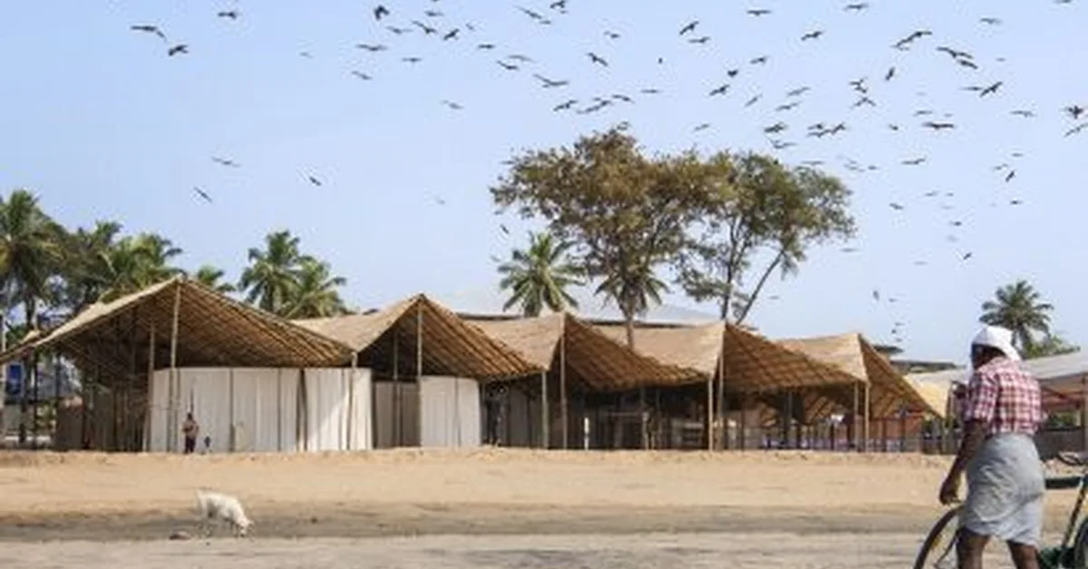 The Purple Ink Studio designed a temporary German Pavilion at the Kerala Literature Festival to highlight historical ties between Kerala and Germany, featuring a ship sail-like roof made of bamboo and local materials. This pavilion serves as an example for content creators on how to blend cultural narratives with sustainable design practices in temporary structures.